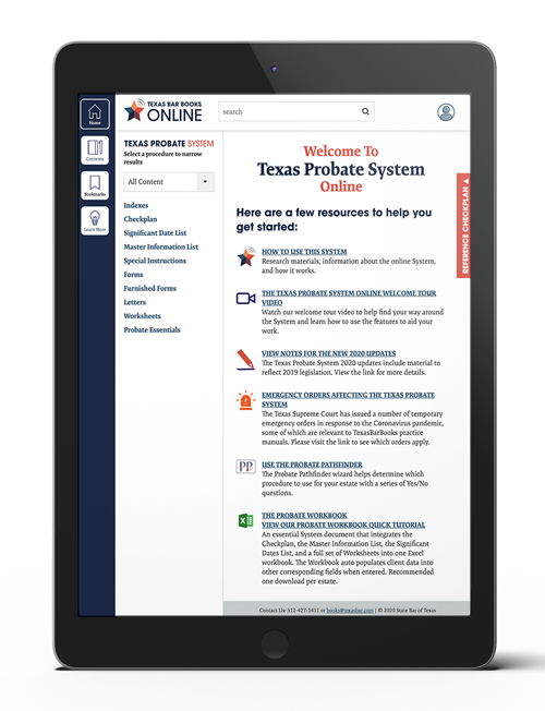 Texas Probate System will become the cornerstone of your probate law practice. From the initial contact with a client to the closing of the estate, this System will be in constant use, providing a step-by-step guide to the efficient handling of a decedent’s estate. Take advantage of letters, forms, worksheets, a significant date list, and a checkplan, all designed to take you through a probate matter from beginning to end.